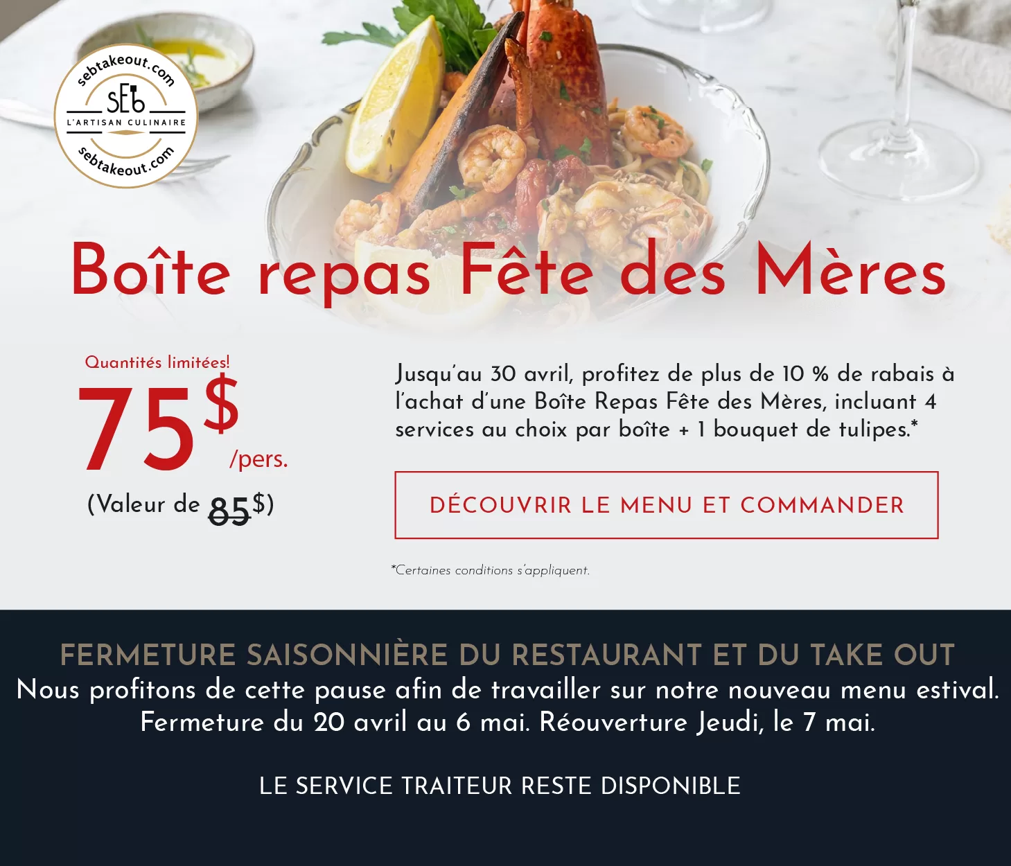 Depuis quelques années, afin de répondre à une demande grandissante, nous avons mis au point un service exclusif de plats à emporter. Commandez en ligne avec sebtakeout.com et offrez-vous un inimitable plaisir gustatif à votre table, chez vous. Nos menus déploient au fil des saisons un bouquet de saveurs toujours fraîches, impétueusement variées. Pour ne manquer aucune de nos offres exclusives, du traditionnel éclatant à l’exotique magique, abonnez-vous à notre infolettre ou suivez-nous sur Facebook et Instagram.